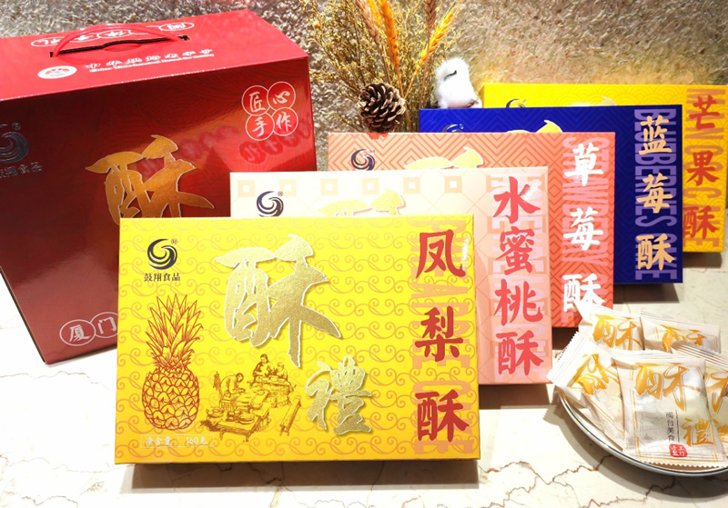 凤梨酥,草莓酥,芒果酥,蓝莓酥,水蜜桃酥 外皮酥松化口 内馅甜而不腻! 闽台伴手礼 凤梨酥 凤梨果肉厚,汁多而浓稠,吃起来甜津津的。